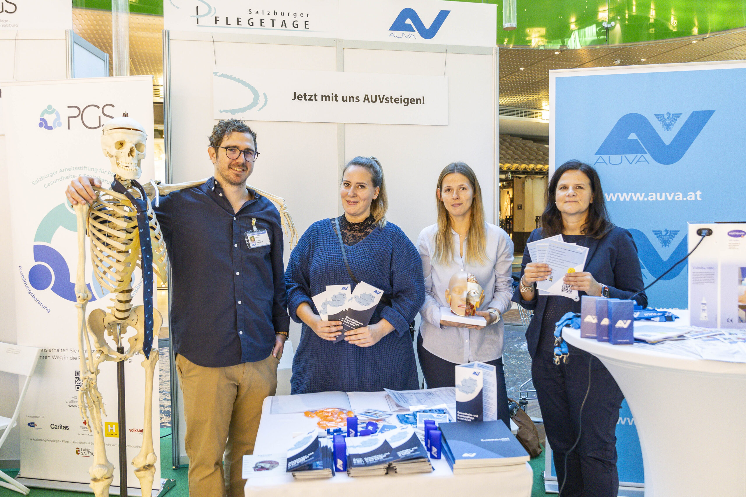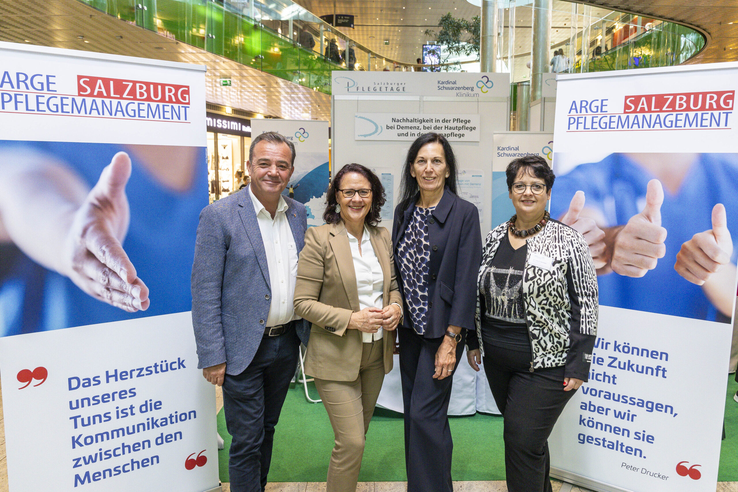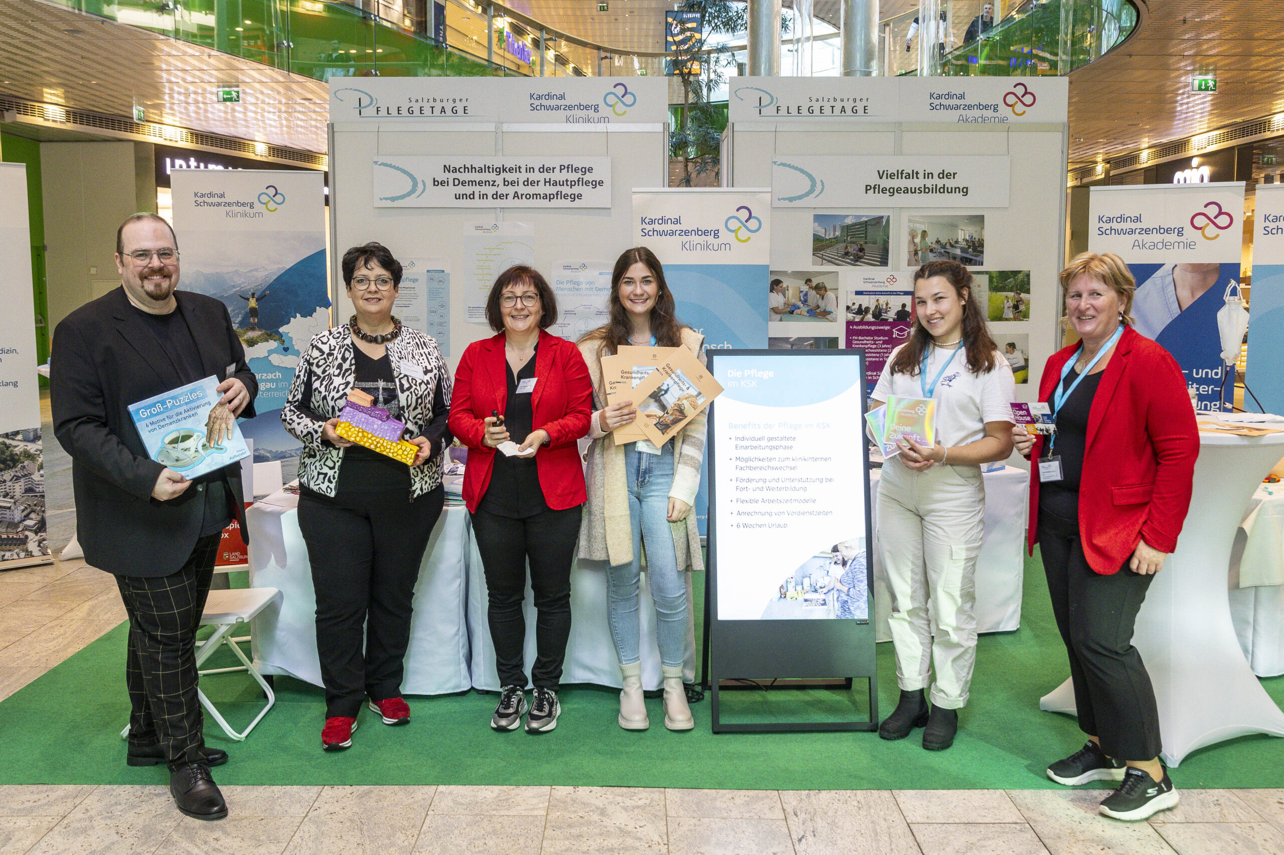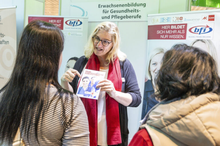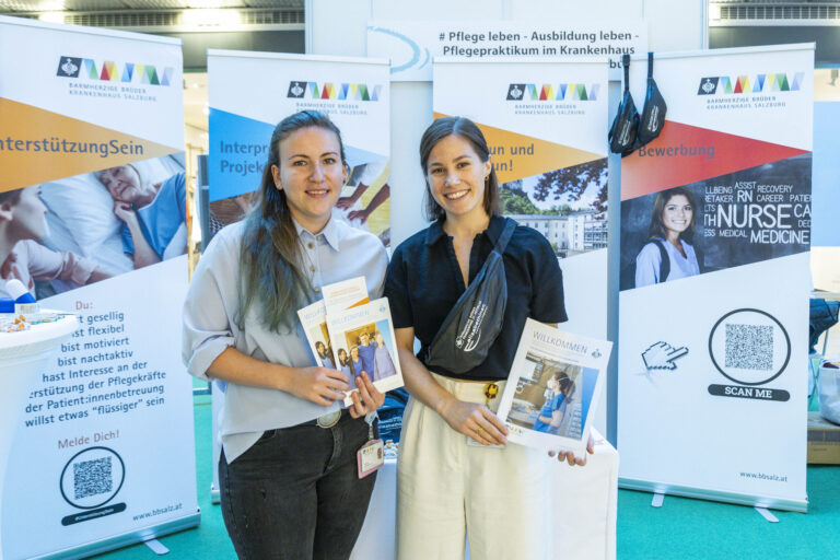 Unter dem Leitmotiv „Pflege wirkt – Prinzip Nachhaltigkeit im Pflegeberuf“ nutzten über zwanzig Akteurinnen aus Akut-, Langzeit- und Ausbildungseinrichtungen die Gelegenheit, sich und ihre Leistungen vorzustellen. Die Salzburger Landeskliniken (SALK) waren an sechs Ständen präsent und zeigten neben onkologischer Pflege auch ihre Gesundheits- und Krankenpflegeschule sowie Möglichkeiten der Intensivbetreuung. Der Studiengang Gesundheits- und Krankenpflege der FH Salzburg lud Besucherinnen zu einer immersiven VR-Simulation realer Pflegesituationen ein und machte damit moderne Ausbildungswege greifbar.
