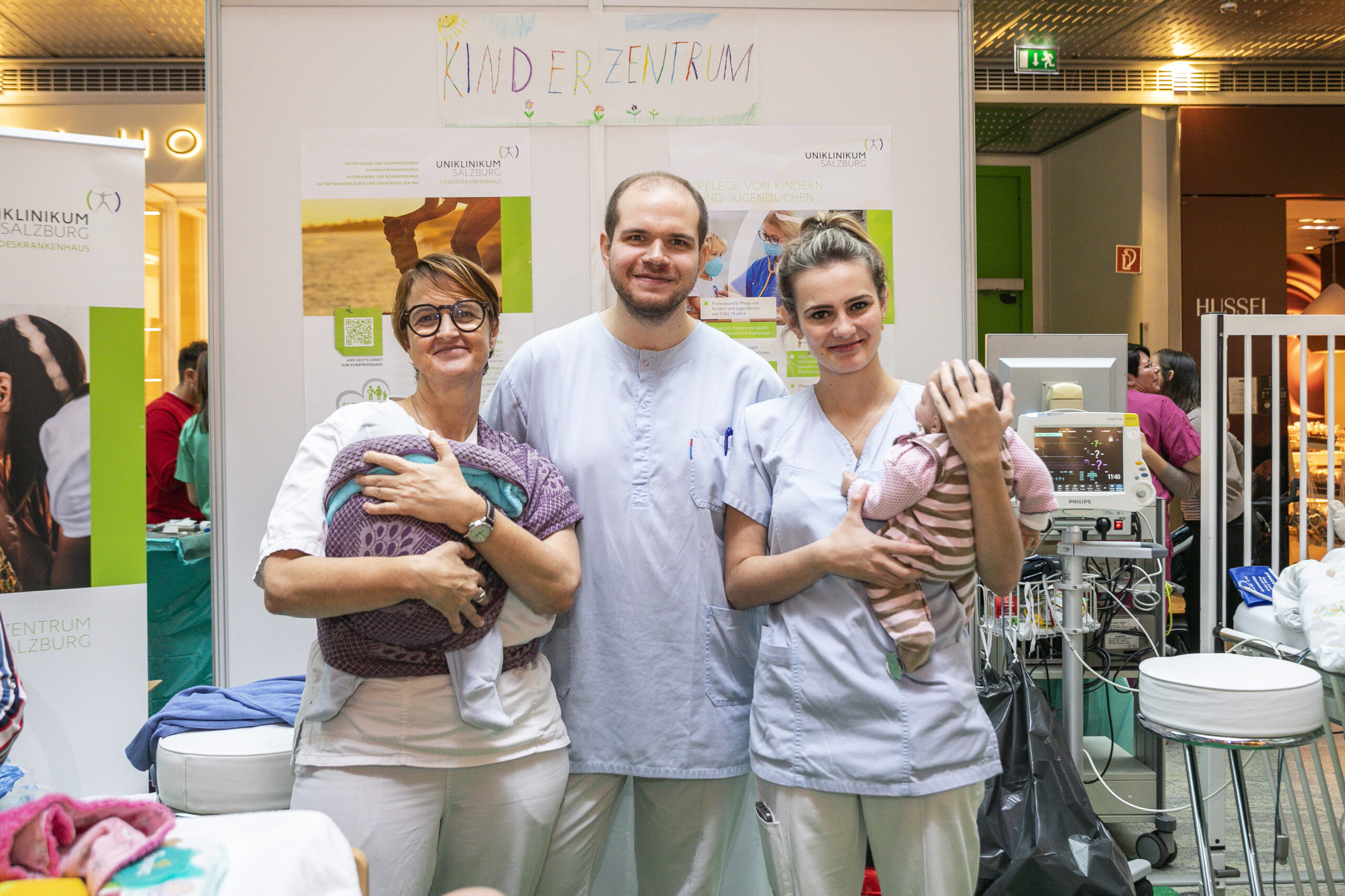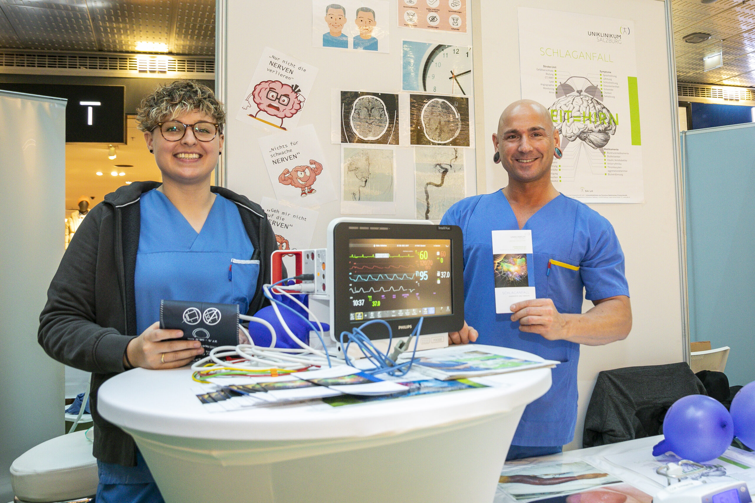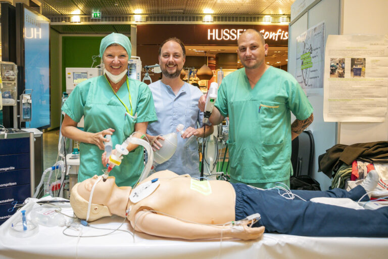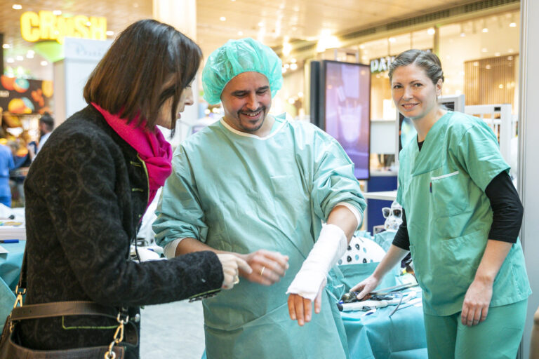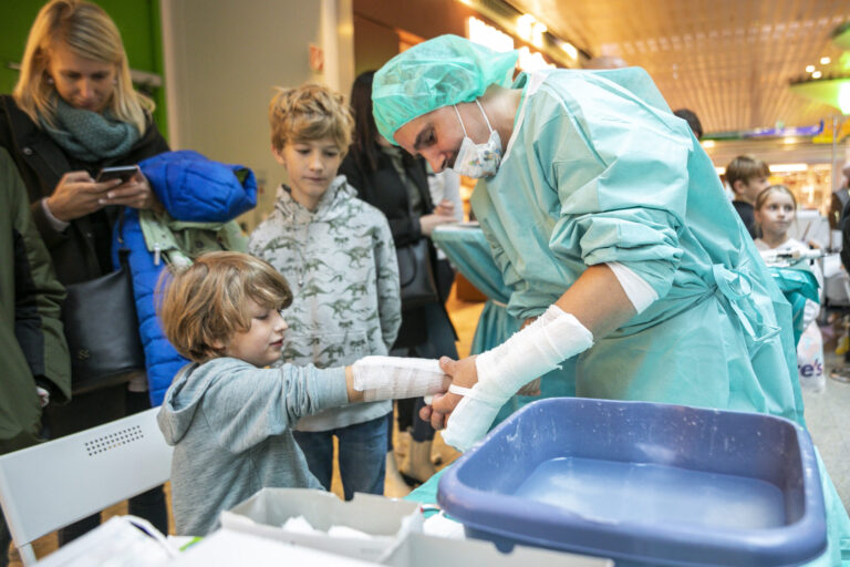 Besucherinnen wurden an Beratungsinseln zu Ausbildungspfaden, Quereinstieg und Berufsalltag informiert, während Kinder bei den beliebten „Teddybären­operationen“ in die Rolle kleiner Chirurg*innen schlüpften und spielerisch Berührungsängste abbauten.